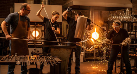 A team of four artisans works in unison in a glassblowing studio, shaping a large bubble of glowing, molten glass. The intense heat of the furnace is visible in the background as sparks fly, capturing the dynamic and skillful process of this traditional craft.
