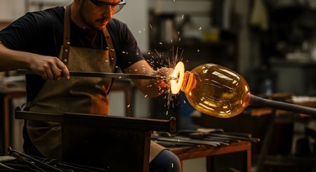 A skilled glassblower, wearing safety gear, uses a tool to shape a glowing, amber-colored piece of molten glass, sending sparks flying. The image captures the intense heat, precision, and artistry of the glassmaking process in a workshop.
