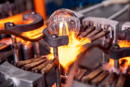 Automated workshop conveyor for production of glass lamps bulbs factory.
