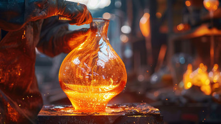 A glassblower crafting a beautiful glass vase in a hot shop, demonstrating artisan expertise