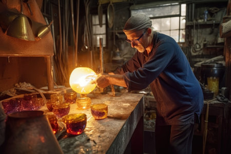 Artisan is shaping molten glass in a workshop, surrounded by tools and materials, demonstrating the intricate process of glassblowing and the beauty of craftsmanship, AI generated