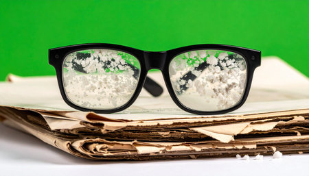 A pair of smudged eyeglasses rests atop a pile of decaying, vintage newspapers, symbolizing a struggle for clarity amidst outdated or obscured information. The dirty lenses suggest a lost perspective or the difficulty of discerning the truth from the past.
