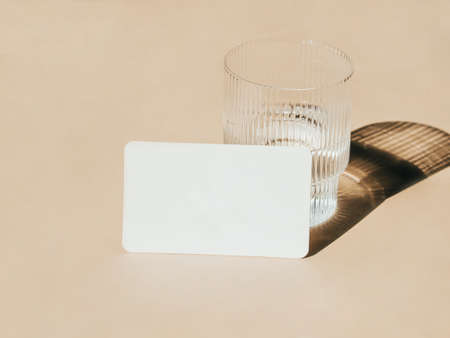 White blank card for text mockup and glass of water on beige background. Minimal concept for busines, message or invitation in pastel colors. top view. copyspace.