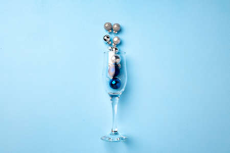 New Year and Christmas party concept. Top view flat lay wine glass with scattered golden star glitter. Copy space. Background minimal style.