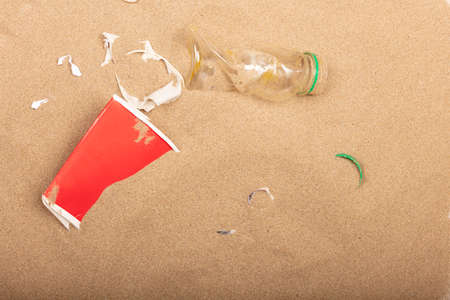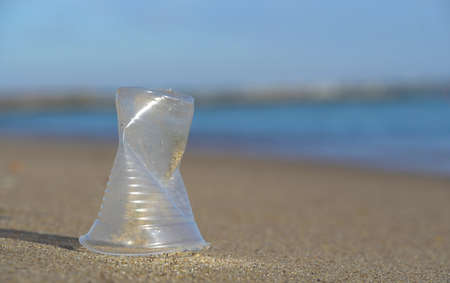 Man hand closeup with isposable plastic glass discarded on sandy sea coast,pollution