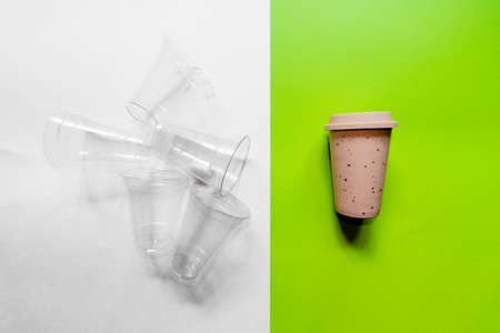 Caring for the environment. Choosing a single reusable cup over a disposable plastic cup. Comparison of plastic cups and reusable.