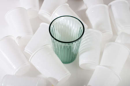 Glass among many plastic cups. Glass or plastic. Reusable versus disposable. Zero waste concept. Stop plastic pollution.