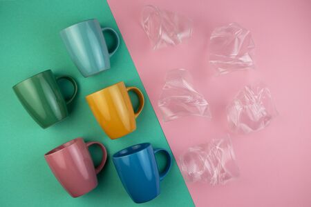 Ecology concept stop plastic pollution. Plastic waste. Pattern from ceramic mugs and plastic cups Flat lay, top view