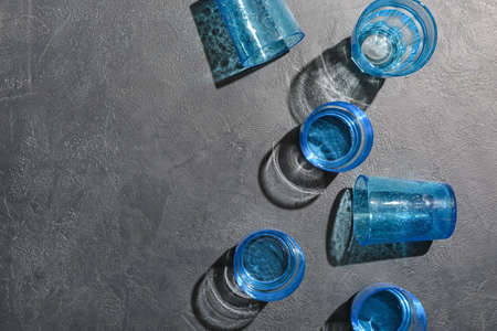 Flatlay of three glasses containing transparent pure water on grey background surrounded by copyspace for your text