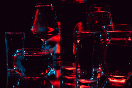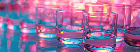 A dynamic close-up of colorful glassware reflecting pink and blue light, creating an abstract and vibrant artistic composition.