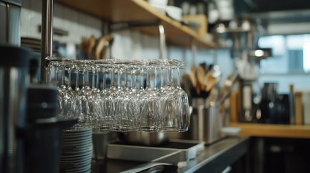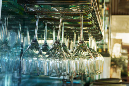 clean wine glasses hang over the bar. Glass, utensils, objects.