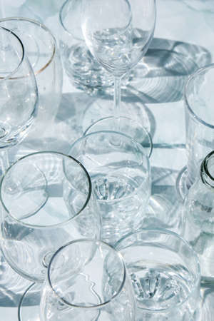 Beautiful different glasses stand on white background in sunlight and create shadows. Hard light, long shadows. Creative concept of drinks, alcohol cocktails. Glassware concept. Geometric shapes