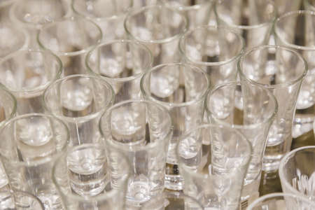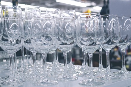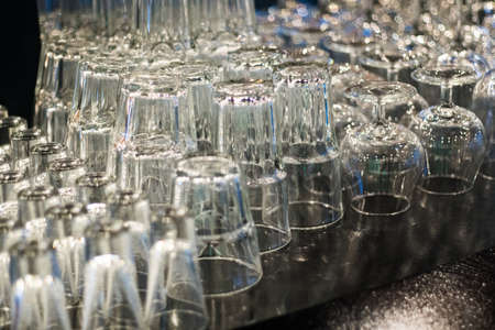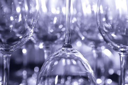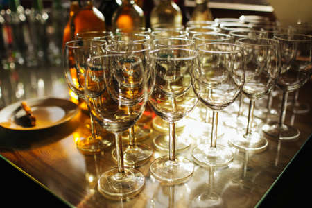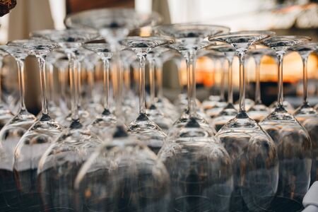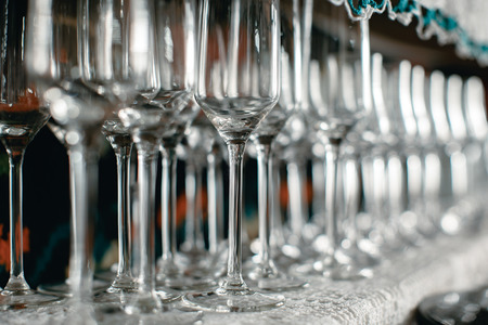 Lots of empty wine glasses on the bar, close up. Restaurant serving.