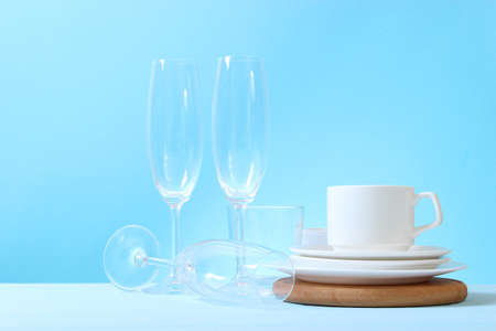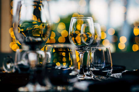 Empty glasses set in restaurant, empty wine glasses on the table different type