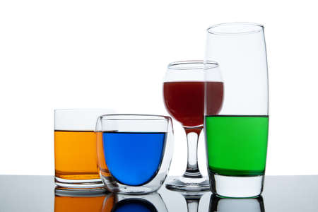 Multi color glass party cups arranged on white background. Empty glassware, colorful dots and circles background, selective focus.