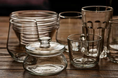 Various glass new empty decanters and cans for drinks and wine on shelf.