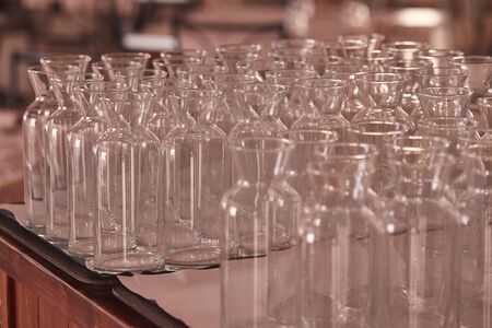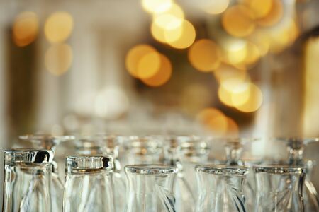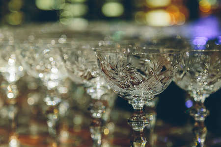 Group of empty and transparent champagne glasses in a restaurant. Clean glasses on a table prepared by the bartender for champagne.