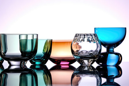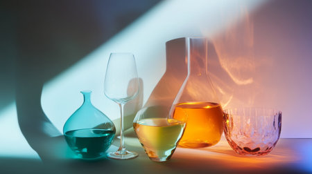 A set of colorful glassware illuminated by soft and warm lighting, creating a vibrant and artistic display.