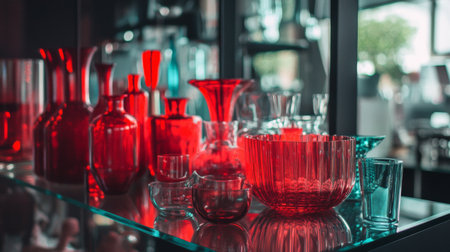 A vibrant red glassware collection displayed on a sleek reflective table, showcasing bold and elegant design.