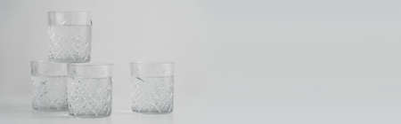 Row of clear glasses with condensation, set against a backdrop of warm, bokeh light, in a cozy evening setting.