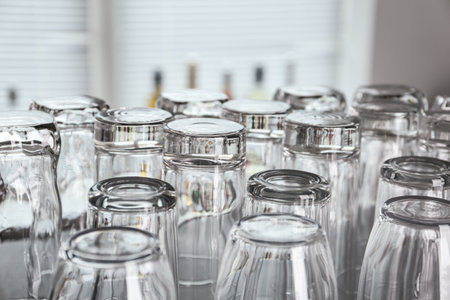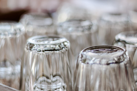 Selected focus close up on bottom of empty transparent drinking glasses placed upside down in group on a table.