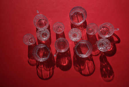 Drink glasses with shadow on red background. Top view. Minimalism, creative layout