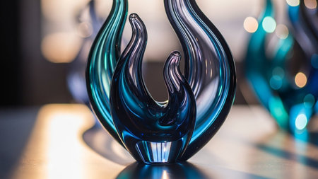 A striking modern glass sculpture in shades of blue and teal, with a fluid, flame-like form.