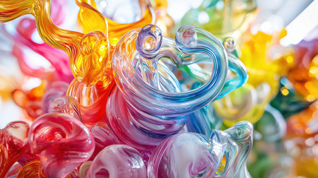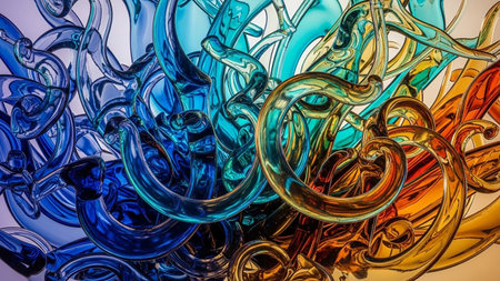A chaotic tangle of colorful, transparent glass tubes and organic shapes. Clear details and vibrant colors enh...