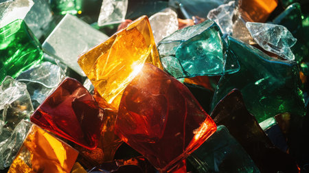 Close-up of recycled glass shards in different colors, glistening under sunlight in a recycling facility
