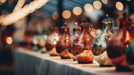 display of multicolored glass vases on market stall, created with generative ai