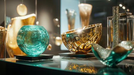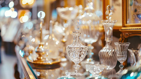 A sophisticated arrangement of glassware with golden accents placed on a reflective surface under soft ambient lighting.