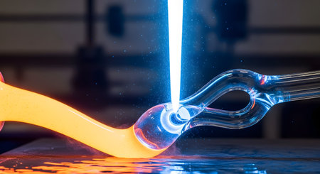 In a high-tech factory setting, a powerful industrial laser beam is used with extreme precision to cut or shape a piece of glowing, molten glass. This image showcases advanced manufacturing processes, automation, and the intersection of technology and craftsmanship in glassblowing.