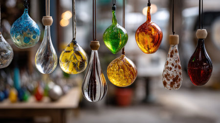 Vibrant and artistic glass ornaments dangle in a workshop, showcasing unique designs and rich colors. Light reflects off their surfaces, adding charm.