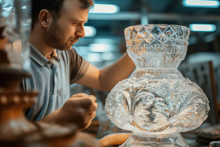Craftsman is carefully carving delicate patterns into a crystal vase, using a specialized tool in his workshop