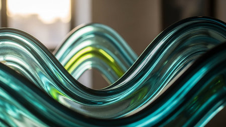 Abstract wavy translucent glass sculpture in teal and green hues with soft light reflections and a blurred background.
