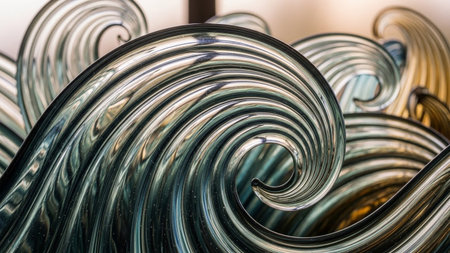 Glass showing collection of clear glass sculptures with swirling shapes and reflective surfaces. resolution...