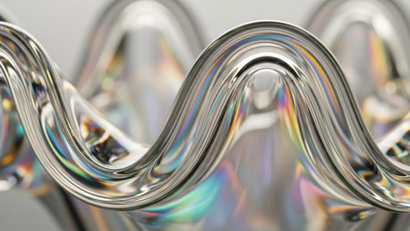 Close-up of molten glass with iridescent rainbow refractions creates a fluid, abstract, and highly reflective...