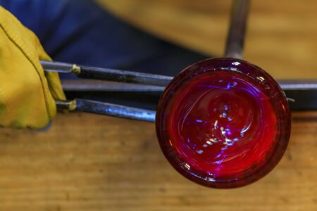 Close up of a glassblower artisan shaping the hot molten glass at strong fire inside a workshop. Manual glass processing by the craftsmen inside a glass factory