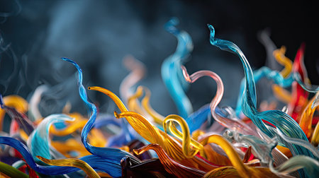 An abstract glass sculpture presents flowing, colorful forms against a dark backdrop. The artwork showcases vibrant hues, swirling lines, and intricate curves. It could be used for decorative purposes, creative projects, or visual storytelling. The composition captures the play of light and shadow.