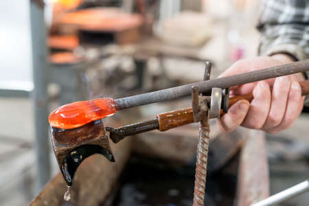 Glass blowing The hands of the craftsman working with molten glass Traditional crafts
