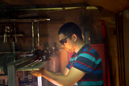 Phetchabun, Thailand - July, 15, 2017 : Handicrafts man making a glass animal with a flaming blowtorch on new glass art piece at Khao Kho Phetchabun Thailand.