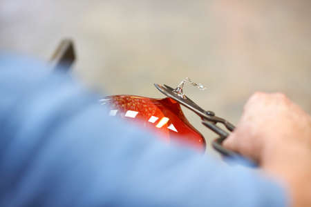 Glass blowing craft shop. Worker`s hands with tools image. Masterpiece creation moment