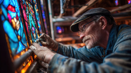 Craftsman is applying another piece of stained glass to the broken antique window.