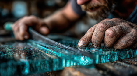 A skilled craftsman focuses intently on shaping glass in a sunlit workshop. The image captures the intricate details of hands at work, showcasing craftsmanship and dedication.