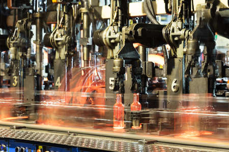 Hot glass bottles on a glass production line