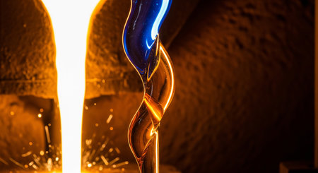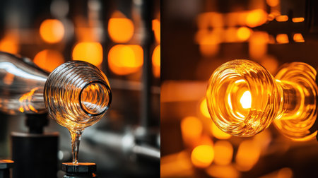 Witness the intricate process of glassblowing, featuring molten glass in warm amber tones flowing gracefully from a spouted vessel, showcasing artistry and skill.