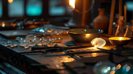 glassblowing tools on a workshop table, created with generative ai