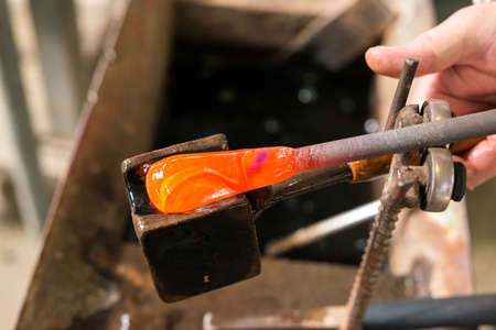 Glass blower manufacturing process, working on a bubble of melted glass on a rod by heating it up by hand in a kiln at a glass maker's workshop