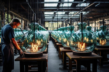 A glassblower inspects glass products at a traditional glass factory.