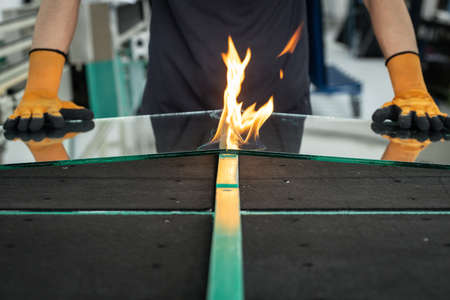 Glazier cuts safety glass, VSG (Very Safe Glass) The fire burns through the foil connecting the panes, A specialized technique of cutting laminated glass